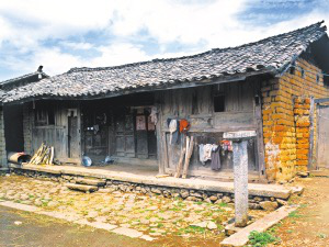 隴川縣戶撒鄉(xiāng)曼旦寨是阿昌族古老的村寨之一,明、清時期的老宅皆以楠木建造,數百年不朽、無蟲蛀。受漢族文化影響,傳統(tǒng)民居大都是土木石結構的三合一照壁或四合院落。正房建在長方石條加土方壘起的屋基上,屋基下為院壩,以三層石階上下。正房三開間,四排五柱,中柱起脊,形成雙斜面屋頂,上覆凹型青瓦。后墻和兩側山墻以土坯砌筑,外面不抹泥,左右是廂房或照壁。室內隔墻均為木板,中間一間為堂屋,有一米多寬的吞口,六扇雕刻的木板門,平時只開中間兩扇。兩邊的檐柱頭有粗獷的木雕。吞口有走廊的作用,一般左側角設臉盆架以供洗漱,板壁上掛小鏡框以便梳妝,旁邊掛著家人的照片。有的擺著縫紉機,有的放藤椅小憩。右側放臨時的農具,掛衣服,板壁上貼著影視明星的招貼畫。堂屋正面板壁是通高的木雕佛龕,供奉佛像和傣文的經文,龕楣上貼著三至四層掛錢,下面有燭臺、香爐。左側擺著電視機、熱水瓶、茶桌,板壁上掛著戶撒刀和手工編織的背兜,右側有專供老人休息的床或藤椅,也有的砌火塘,火塘的小土臺上放著炒菜的調料、火柴和照明燈具。