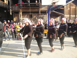 據(jù)當(dāng)?shù)卣辖榻B,毛坪村過苗年跳蘆笙,歷來都是光腳跳。寨老茍吳說,光腳板跳,才接地氣,才能碰觸到列祖列宗的靈魂,與祖先共舞。傳統(tǒng)蘆笙舞跳完,當(dāng)?shù)貗D女還要舉行“大女子主義”舞蹈表演。這種舞蹈,最大特征就是婦女們把男性的一面以夸張的手法表現(xiàn)出來。領(lǐng)隊(duì)的婦女要口叼長(zhǎng)煙斗,臉畫長(zhǎng)胡子,左腳光腳丫,右腳穿鞋,邊走邊舞,滑稽無(wú)比。隊(duì)后的婦女,雙腳不能穿同樣的鞋,嘴叼香煙,“裝模作樣”,妙趣橫生。這種滑稽舞蹈,引來全寨村民和賓客歡笑,整個(gè)村寨其樂融融。