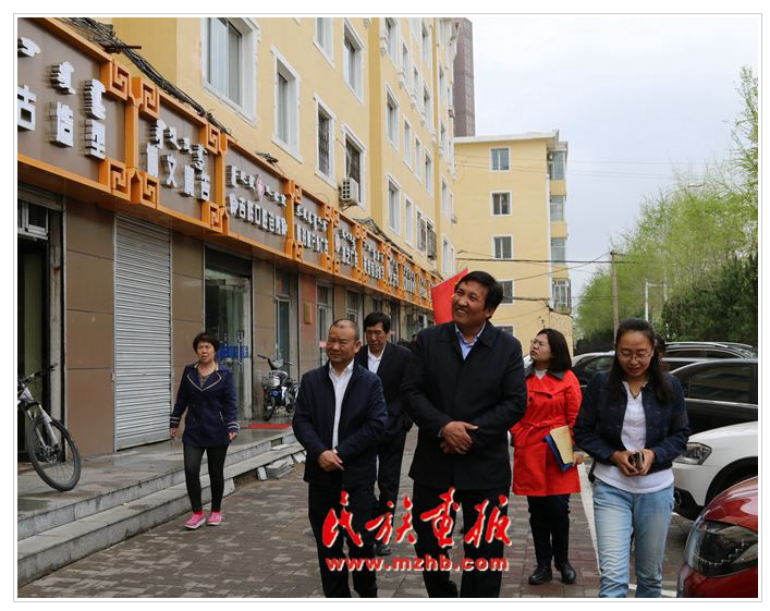 2017年5月3至4日,內(nèi)蒙古自治區(qū)民委副主任薩楚日勒?qǐng)D(前左二)、語(yǔ)文處處長(zhǎng)曹雙喜(前左一)檢查呼和浩特市的蒙漢雙語(yǔ)牌匾情況(民族畫報(bào)資料)