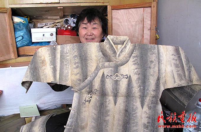 魚(yú)皮服飾是赫哲族魚(yú)皮文化的重要組成部分,其制作工藝十分精巧,是赫哲族獨(dú)有的民族服裝(袁東平 攝影)