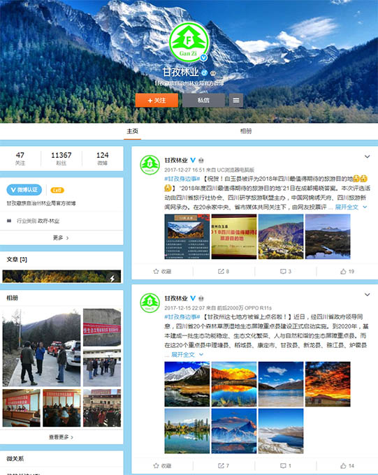近年來甘孜林業(yè)積極拓展“內(nèi)宣+外宣”“兩條腿走路”的新媒體運營模式。一方面通過甘孜林業(yè)無線站點和微信平臺向州內(nèi)群眾宣傳黨的惠民政策、普及林業(yè)方面知識、展現(xiàn)甘孜林業(yè)人精神風貌;另一方面通過甘孜林業(yè)頭條號和微博進行外宣,吸引更多熱愛甘孜的人到甘孜投資創(chuàng)業(yè)和旅游觀光。