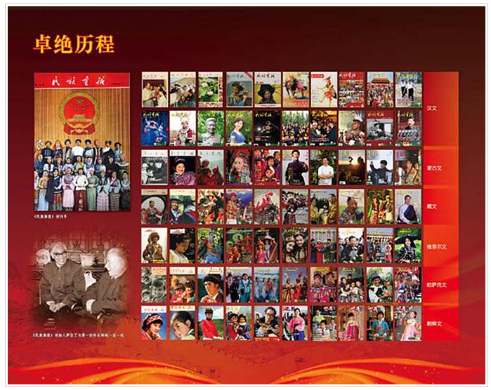 《民族畫報(bào)》創(chuàng)刊于1955年2月,周恩來總理題寫刊名?!睹褡瀹媹?bào)》用漢、蒙古、藏、維吾爾、哈薩克、朝鮮等6種文字出版,發(fā)行全國各省市區(qū)及世界50多個(gè)國家和地區(qū),一直與《人民畫報(bào)》《解放軍畫報(bào)》并成為“中國三大畫報(bào)”。2013年獲“中國百強(qiáng)期刊”稱號(hào)