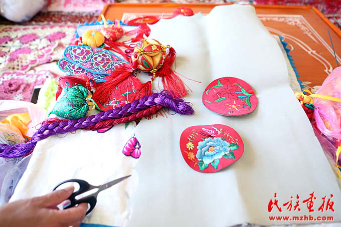 走進(jìn)她的家中,只見不大的房間中擺滿了荷包、繡花鞋墊、枕頭等刺繡品。桌上五顏六色的彩線旁,馬阿英社和兒媳婦正聚精會神地依著設(shè)計好的圖案“飛針走線”。