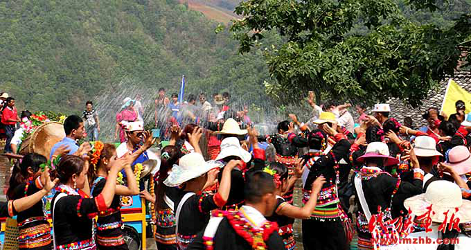 節(jié)日清晨,在象腳鼓樂和歌聲中,年輕人將水桶高高舉過頭頂,將水滴灑在老年人的手上,祝愿他們生活快樂、健康長壽。老人們則伸出雙手,將水捧在手中,口念祝詞,為年輕人道喜、祝福。這種儀式之后,人們便以象腳鼓為前導(dǎo),排成長隊(duì),擁向泉邊、河畔,唱歌、跳舞,互相追逐、潑水。從頭到腳,全身濕透。這是吉祥的水,祝福的水,人們盡情地潑,盡情地澆,不論是潑水者還是被潑者,都高興異常,笑聲朗朗。楊臘苦介紹說,澆花節(jié)既是德昂族人民歡度新年的典禮,又是男女青年談情說愛,尋找心上人的好時(shí)機(jī)。