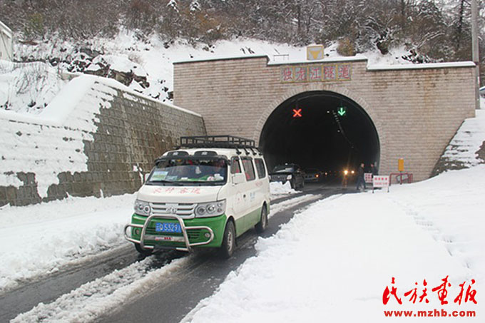 2014年4月獨龍江公路高黎貢山隧道貫通,農(nóng)村客運車輛在鋪滿雪花的路上駛進(jìn)駛出