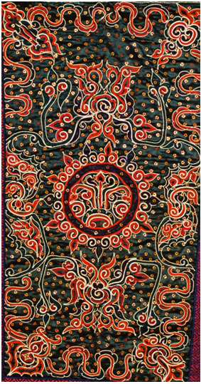 而在背兒帶下部的中心圖案則是一個(gè)古老的傳統(tǒng)紋樣。主體形象以同心圓為主,里面的幾何裝飾圖案依次向外擴(kuò)散,就像太陽(yáng)的光芒一樣向四周散射。圓是一個(gè)太陽(yáng),里面有一棵樹(shù),即小孩的生命樹(shù),寓意生命之樹(shù)長(zhǎng)青,樹(shù)上有一顆石榴花,寓意多子。太陽(yáng)周圍彩帶狀紋樣代表雷鳴與閃電。雷神的地位在水族社會(huì)中是至高無(wú)上的,能主持正義、懲惡揚(yáng)善。背兒帶上繡雷鳴便是祈求雷神對(duì)幼兒的庇佑。太陽(yáng)紋與雷神的象征圖案組合,是水族自然神崇拜信仰的寫照。太陽(yáng)圖案上下繡有兩只大蝴蝶,左右各繡一只老鷹。下部的四角是葫蘆紋,葫蘆的形象源于水族的創(chuàng)世神話。天地初始之時(shí)洪水泛濫,作為水族先人的兄妹二人為了躲避洪水,棲身于一支大葫蘆中,直至洪水退去。兄妹二人走出葫蘆,結(jié)為夫妻,繁衍生息,才有了今日成千上萬(wàn)的水族兒女。于是,葫蘆被賦予了繁衍、生殖的意義。