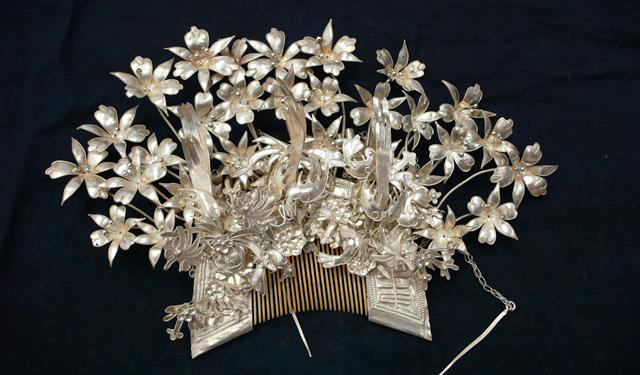 銀鳳冠和銀花帽是頭飾中的主要飾品,也是整套銀飾系列之首,素有龍頭鳳尾之美稱,其制作較為復(fù)雜,使用的小件飾品少則一百五十余件,多則達(dá)兩百余件,價值昂貴。苗族銀飾,如同苗族刺繡、織錦、蠟染等裝飾物一樣,是苗族支系相互區(qū)別的重要表征,不同地域的銀飾有著不同的特征。