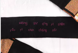 在北京服裝學(xué)院民族服飾博物館藏的這條白褲瑤男子盛裝腰帶的背面,就繡有“相識(shí)情義深,友誼春常在”的拼音,也許就是一對(duì)白褲瑤青年男女的愛(ài)情密碼。