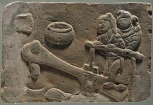 長(zhǎng)31厘米,寬19厘米,厚5厘米,呈長(zhǎng)方形。生動(dòng)刻畫了一個(gè)推磨的場(chǎng)景。磨的一端為一婦女,一端為一小男孩。婦女頭梳圓形發(fā)髻,身著長(zhǎng)裙、短上衣系長(zhǎng)帶,雙手握推杠于胸前,眼睛注視著推杠另一端身高不及杠的小孩。小孩全身裸露,背朝外,頭向上昂起,看著高過頭頂許多的推杠,雙手作吃力地推杠狀。整個(gè)畫面將母子二人推磨時(shí),母親憐愛孩子的情景淋漓盡致地表現(xiàn)出來。