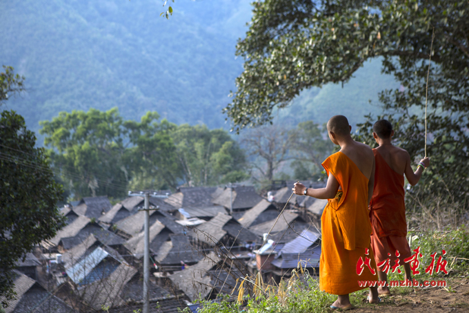 扶貧攻堅(jiān)決定張家老寨全部拆除重建,兩位僧人注視著即將消亡的老寨(攝于2015年1月,布朗山張家老寨)