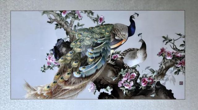 原作是畫家張玉明的工筆畫作品。一對(duì)孔雀棲息于爛漫盛開(kāi)的山茶花間顧盼回首,相映成趣。整體繡面繡工精細(xì)、絲光迥動(dòng),將蘇繡精、細(xì)、雅、潔的特點(diǎn)表現(xiàn)得淋漓盡致。