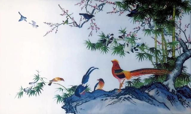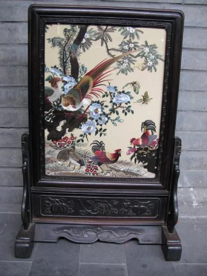 取材于古畫,采用蜀繡的運(yùn)針、輔針、切針、沙針、滾針、打籽針等針?lè)ɡC制。樹(shù)木花草層次分明、古樸自然,錦雞蝴蝶色彩艷麗。