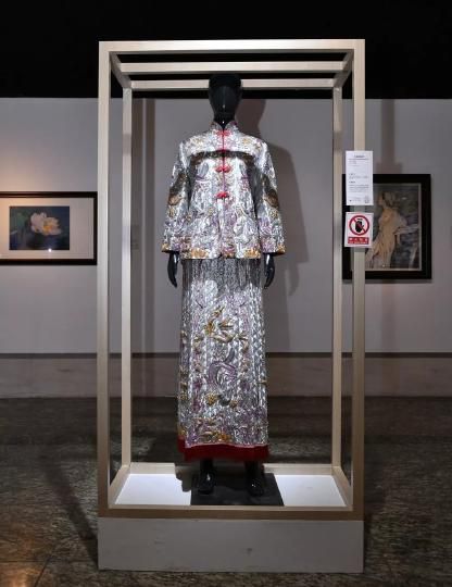 龍鳳褂裙,為女子出嫁與善終之時(shí)所穿之物。本作品采用精細(xì)金銀線配以潮繡墊高技法,繡制龍鳳圖案多達(dá)70余只,成為褂裙等級(jí)中的最高規(guī)格“褂王”。