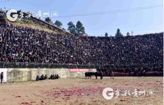 貴州省從江縣第十五屆原生態(tài)侗族大歌節(jié)的前一天,恰逢該縣逢亥斗牛日,丙妹鎮(zhèn)松學(xué)斗牛塘、谷坪鄉(xiāng)四寨河斗牛塘同時(shí)舉辦傳統(tǒng)牛王爭(zhēng)霸賽,喜迎一年一度“侗族大歌節(jié)”的到來,共有來自周邊村寨的80頭水牯牛參戰(zhàn),斗?;顒?dòng)場(chǎng)上名牛角逐,場(chǎng)面異彩紛呈,吸引數(shù)萬(wàn)名觀眾前來觀戰(zhàn)。