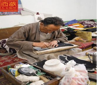 坐在工作臺(tái)上的赤列塔青,身材高大,穿一身合體的淺色藏裝,前擺上沾著幾星鼻煙,長(zhǎng)期用針的手指有些變形。翻開他的履歷發(fā)現(xiàn),赤列塔青可以說是拉薩少有的制靴世家,他的父親邊巴頓珠在舊社會(huì)是個(gè)給人支差的貧苦鞋匠,靠給有錢人修鞋、做鞋為生。今年68歲的赤列塔青性格沉穩(wěn)、做事穩(wěn)健,他12歲當(dāng)學(xué)徒工,做鞋做了56年,如果再加上父輩的修鞋歷史,時(shí)間更長(zhǎng)。在今天的拉薩有這樣經(jīng)歷的人算是屈指可數(shù)了。赤列塔青從小就在父親和師傅身邊打下手,逐漸掌握這個(gè)足以養(yǎng)家糊口的一技之長(zhǎng),終于成長(zhǎng)為一個(gè)勤奮而多才的手工藝人,開始了穩(wěn)坐一隅的匠人生涯。