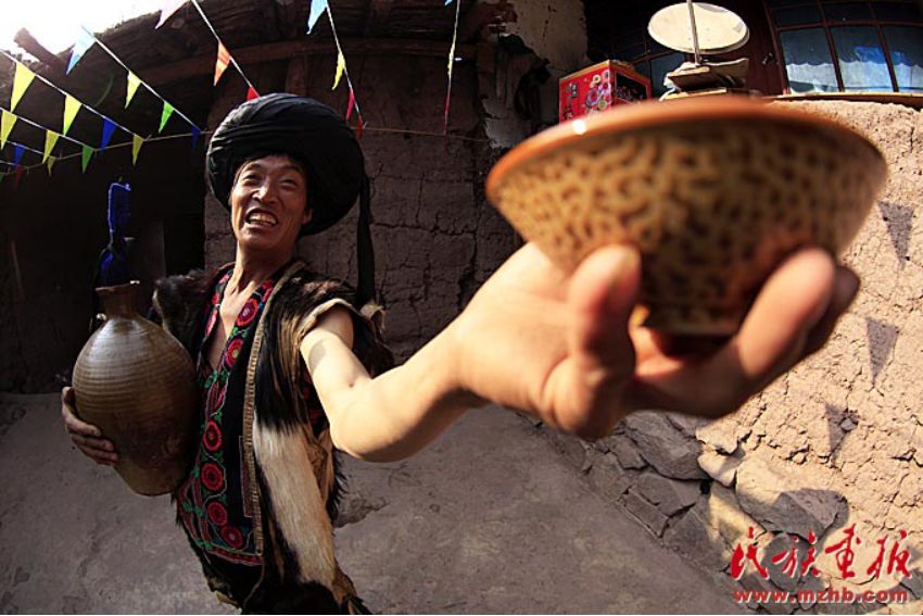 娶親隊伍要在當(dāng)天早上十一點前到達女方家。娶親隊伍快到女方家時,女方家緊閉著正房門。門里,躲藏著一群機靈、活潑的年輕人,有的端著水,有的拿著黑色染料,等待著接親人的到來。當(dāng)接親人一行跨入女方家時,鴉雀無聲的沉寂局面頓時沸騰起來,四處躲藏的青年男女出其不意地一擁而上,對接親人又是潑水,又是抹黑臉,或拉進畜圈。這些活動一方面意味試探新郎派來的娶親人是否精明能干,活潑機靈,另一方面也增加了娶親活動的熱鬧氣氛,總之,一片歡聲笑語,好不熱鬧。娶親人即使一身被淋得濕漉漉或抹得滿臉漆黑,也是一副笑逐顏開的樣子。