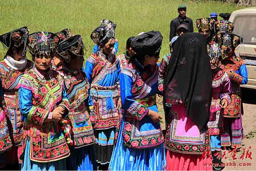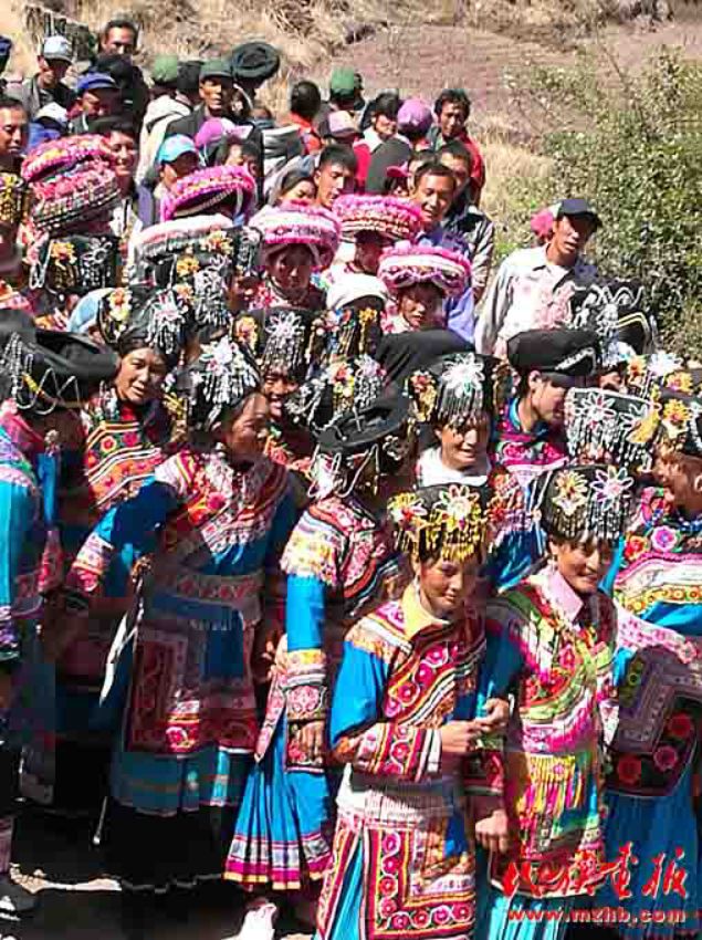 娶親要請客,當(dāng)?shù)乩圩逭埧椭恍杩陬^傳話,凡是知道的親戚朋友都會來參加。娶親隊伍主次兩位主婚人,伴郎伴娘各一人,背新娘和嫁妝的二人,接親的四至六人,其中有一至兩個歌手,一行十二人組成。帶著早已為新娘準備好的花短衣、長裙、銀手飾、圍腰鏈、銀泡、銀項等飾物興高采烈地從新郎家出發(fā)。