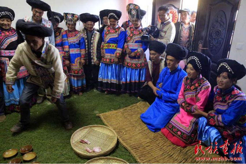 晚飯后,是新郎新娘參拜儀式,在香煙繚繞中,新郎新娘男右女左的并肩站在祖宗堂前,在主婚人洪亮的祈禱聲中,新郎新娘一拜天地,二拜祖宗,三拜父母,而后新郎新娘雙雙對拜。禮畢,主婚人要給新郎新娘取喜名,傈僳族婚禮中取喜名十分重要,結(jié)婚后只用喜名。取喜名是根據(jù)結(jié)婚時男方送往女家的彩禮來定的,也有以當(dāng)時的氣候和其它情況為根據(jù)來定的。宣布喜名后,新郎新娘搶新房,比賽脫婚服,清點禮金和禮物,誰點的多,以后就由誰當(dāng)家。