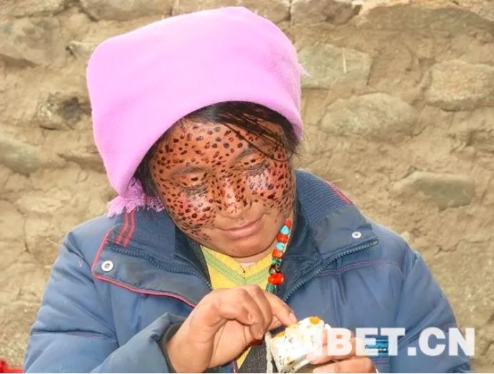 一般情況下,藏北牧區(qū)婦女外出勞作都會(huì)用圍巾將頭部和頸部圍住,這樣既可以保暖御寒又可以抵御強(qiáng)烈的紫外線。而“安達(dá)”可用于涂抹除了眼睛、嘴巴、鼻子外所有臉部區(qū)域。涂抹在臉上的“安達(dá)”自然干了后,婦女們往往會(huì)等到第二天甚至第三天再用溫水洗凈。