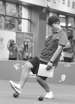 在分組循環(huán)賽女子單蹴中,河北隊員趙佳美遇到了強勁對手——福建隊男女混合雙蹴一等獎得主鐘金雪。趙佳美發(fā)揮得不錯,雙方比分始終咬得很死。鐘金雪起腳擊球干凈利落,在比分上形成壓制。