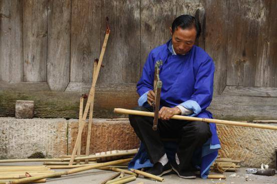 制作蘆笙大的工序有12道,再細(xì)一點(diǎn)有幾十項(xiàng)。如第一道是到山上去選竹子,拿尺子慢慢比劃,三拳的有多長(zhǎng),要很細(xì)心地選,確實(shí)可以用。取下來(lái)之后,第二道工序是拿到河邊去洗,用紗布搓。因?yàn)橹窆苡泻芏喟唿c(diǎn),關(guān)節(jié)處有很多毛,要很細(xì)致的把那些東西全搓掉。弄好之后用太陽(yáng)曬,曬干曬白。第三道工序,就是取杉樹的木頭做笙斗,計(jì)劃好做三拳的是多少公分,四拳是多少公分。十二道工序,后面越學(xué)越復(fù)雜,每一道工序都很講究。