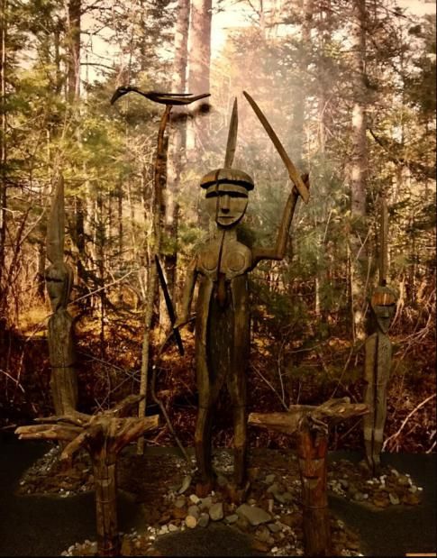 展區(qū)內(nèi)還放置著一組木質(zhì)神偶,這些神偶來自赫哲族部落。佇立在最中間的神偶起著山神的作用,面目清晰與人等高,手中舉著木劍,挖空的腹部能吞掉妖魔鬼怪,一顆碩大的心臟代表強(qiáng)悍的法力,靠墻斜放著一根高高的木桿,頂端棲息著一只鳥(喬卡鳥)。