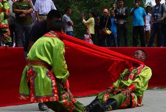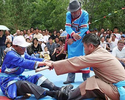 頸力賽和扳棍一樣,也是達(dá)斡爾族傳統(tǒng)的競技項目之一,在達(dá)斡爾族之間十分流行。頸力賽的比賽方式和扳棍相似,比賽雙方需要端坐在平地上,蹬直雙腿,腳掌相對,雙手叉腰或放在腿上,用布腰帶套在雙方脖頸后部。當(dāng)裁判員聲響后,比賽雙方需要互相用脖頸力拉扯對方,哪一方被拉起或屈膝歪倒,就輸?shù)袅吮荣悺?/p>