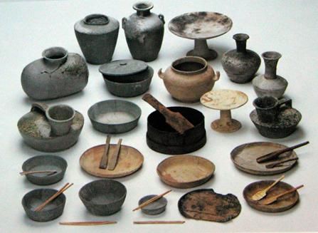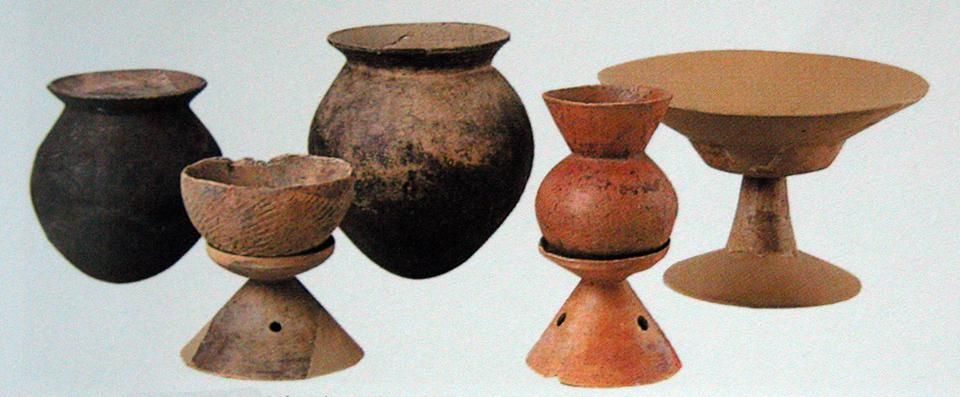 彌生時(shí)代的名稱,源自1884年東京市本鄉(xiāng)彌生町“彌生陶器”的發(fā)現(xiàn)。彌生陶器與繩紋陶器截然不同,為素面,灰色。日本人認(rèn)為彌生陶器是“渡來人”制造的?!岸蓙砣恕笔侵袊?guó)大陸通過朝鮮半島而來,他們帶來了陶器的制作技術(shù)。彌生陶器為深釜器,以甕形器、缽形器、高腳杯(豆形器)為主(圖五)。