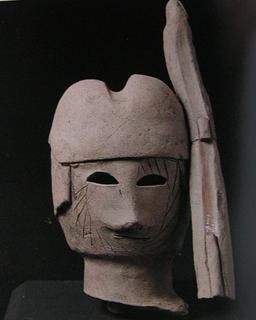 埴輪,為日本特有的器物。埴輪放置在古墳封土表面,即為前方后圓墳中“方”的地方。埴輪分為筒形埴輪,來源于陶器;還有形象埴輪,細(xì)分為器物和人物。埴輪來源于中國(guó)古代墓室中陪葬的陶俑,或古代帝陵神道上的石獸石人。某些埴輪人物有文面,并填墨(圖十六),推測(cè)當(dāng)時(shí)的日本出現(xiàn)了文面現(xiàn)象。