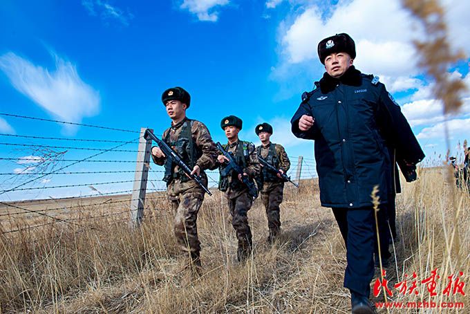 諾門罕布日德邊防派出所副所長敖日奇朗(右一)帶領(lǐng)民警與解放軍邊防連隊(duì)聯(lián)合巡邏。