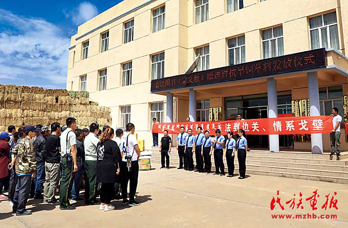 阿拉善盟檢察分院的“法到邊關、情系戈壁”《普法宣傳教育叢書(蒙古文)》贈送暨抗旱救災飼草料發(fā)放儀式。