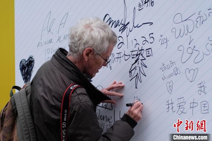 一名外國友人參觀畫展,并簽名?!⒖÷?攝