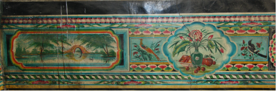 達拉特旗地區(qū)的墻圍畫高度一般在70厘米左右,其長度則依炕的大小而定??簧喜糠值漠嬍侵黧w,在結(jié)構(gòu)上有一套固定的模式,即以上下兩組邊道,按照一定的規(guī)格布置形成主體框架,中間等距離安排各種畫空,既具完整對稱的裝飾形式美感,又具簡繁對比、主從相映的豐富表現(xiàn)內(nèi)涵。邊道圖案種類繁多,有折子邊、卷帶邊、竹筒邊、花邊等。畫空也稱“池子”,有正方形、長方形、扇形、圓形等多種形式。此外,在下邊道與炕距離25-30厘米的范圍內(nèi)是黃顏色的邊子,這樣的設(shè)計是避免炕上物件的遮擋和抬高人的視線,便于觀賞。