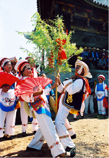 “繞三靈”活動(dòng)的特點(diǎn),除了向本主神靈祈求風(fēng)調(diào)雨順的內(nèi)容之外,主要在于其歌舞活動(dòng)所表現(xiàn)的男女情愛無所顧忌,放達(dá)不拘。每個(gè)歌舞隊(duì)列領(lǐng)頭者均為男女巫二人,他們以一手共執(zhí)一株齊人高的樹枝,另一手分別揮舞牦牛尾和花手巾,邊舞邊唱,引領(lǐng)著隊(duì)伍緩緩前行。樹枝上掛著紅綢系著的葫蘆,據(jù)說葫蘆象征母腹,紅綢象征陰血。他們口唱的調(diào)子稱“活恩枯”直譯為“花柳曲”,一唱一和,幽默風(fēng)趣。其后的歌舞隊(duì)列,唱的也都是充滿艷情的調(diào)子,跳的是霸王鞭和八角鼓舞,舞姿多有男女背靠背、心合心、腳勾腳等形式,無拘無束地表達(dá)著熾熱的情感。