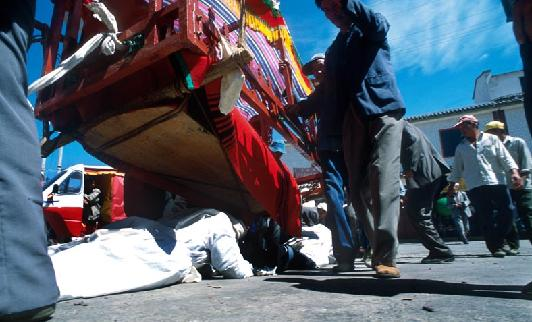 2、出棺送葬:出殯時(shí),街坊鄰友自帶抬具幫助抬棺。為死者念經(jīng)引路,孝男拄拐哭喪棒走在棺前,孝女走在棺后。棺材抬至繞棺處,擺在高凳上,由念經(jīng)先生舉行繞棺儀式。念完《繞棺經(jīng)》,稱為“搭橋過路”,遇到過橋時(shí),孝男跪在橋上,棺從身上抬過,稱為“背棺”。