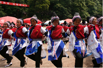 以大理市為主要代表的洱濱區(qū)白族服飾。如周城、喜洲、挖色等白族服飾,他們世代伴水而居,生活環(huán)境十分優(yōu)越,服飾給人一種清新明快的感覺。在很大程度上折射出這種環(huán)境的優(yōu)越性,周城村白族男服飾過去的穿著較為復(fù)雜,纏白布包頭,上衣穿立領(lǐng)對襟布紐衣,俗稱“三滴水”,最里的一件穿白色、中間一件穿藍(lán)色、最外一件穿黑色或是藏青色的外衣,三件衣服都是敞開著,露出內(nèi)穿的兜肚,外穿一件麂皮或山羊皮的領(lǐng)褂,下穿白或藍(lán)色大襠褲,腳穿布底剪口鞋。肩掛繡花掛包。而現(xiàn)在的男裝基本與漢族相同,平時需要穿戴的民族服裝也是改良過較為簡潔的男裝,只有在重大節(jié)日的時候才能看到傳統(tǒng)的著裝風(fēng)采。而女裝的穿戴至今還保持得較為完整,以白、藍(lán)兩色為主,沿承了白族崇尚白色的傳統(tǒng)特點,上身穿白色緊袖裳,外套紅或藍(lán)色右衽領(lǐng)褂,在領(lǐng)褂的紐扣上掛三須或五須銀鏈,銀鏈上綴掛件,有銀質(zhì)的針筒、魚、牙簽、耳勺。手戴金、銀或玉手鐲、戒指。耳戴金、銀耳墜。手袖上套滾邊的大袖小袖,并在袖上鑲各式花邊。腰系繡花短圍裙或系凈白色底外鑲一圈黑色邊的素面短圍腰。下穿白或藍(lán)色滾邊長褲,褲腿邊鑲寬窄花邊,花邊上面繡各類花卉圖案。腳穿繡花尖鞋,又名“白姐鞋”(“柏姐鞋”),鞋面為紅、粉、綠、黑等色,繡有艷麗的花紋。頭飾和過去的頭飾相比較從美術(shù)的角度上看要美得多,特別是姑娘的頭飾,過去傳統(tǒng)頭飾一般喜戴魚尾帽,還有我們在電影《五朵金花》中所看到過的姑娘頭飾,而今姑娘的頭飾讓人一看就聯(lián)想到大理的“風(fēng)花雪月”四大美景。頭戴色彩鮮艷的繡花頭巾,繡花頭帕上端精心梳理出茂密雪白的絨毛,形象的表現(xiàn)了蒼山頂上的皚皚白雪,將發(fā)辮盤繡花頭帕外,纏以大紅絨線,形如滿月,一側(cè)垂下雪白的纓穗飄飄灑灑,象征著終年吹拂的下關(guān)風(fēng)。整套服飾在很大程度上折射出這種環(huán)境的優(yōu)越性,如色彩搭配對比鮮明,簡潔明快,挑花精美,毫無細(xì)碎之感,裝飾繁而不俗等。