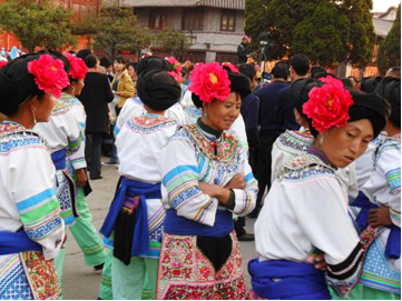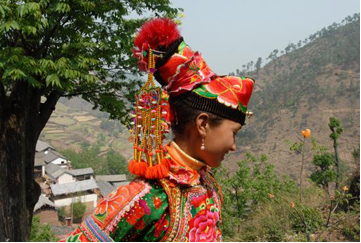 云南巍山彝族回族自治縣各民族如壯麗的織錦,將生活裝扮得五彩繽紛,充滿詩情畫意。其中特別是東山一帶的彝族服飾色彩較為豐富,款式變化多姿,并且以大量的銀制品和刺繡裝飾,制作工藝之精良,堪稱少數(shù)民族服飾一絕。以小孩帽而言,就有魚尾帽、小瓢帽、銀鼓帽、花帽和搭耳帽等數(shù)十種,名目繁多,式樣各異。帽子上都繡有花草、樹葉、龍鳳圖案,鑲嵌著閃亮的銀首飾,十分逗人喜愛。小孩的衣服式樣也很多,大多由紅、藍、綠、白幾種顏色的布料縫制而成,紅綠交織,藍白相襯,非常艷麗。如花朵一般的彝族少女通常頭戴銀鼓帽,墜耳環(huán)、身穿藍領褂,腰系花圍裙,下著綠彩褲,背掛圓裹背。銀鼓帽和繡花鞋做工極為精巧,全套裝飾花團錦簇,恰似一只開屏的孔雀。結婚后的婦女就不再戴帽子,改為結發(fā)髻,裹包頭。發(fā)髻一般呈寶塔狀,外裹黑紗和黑布包頭,發(fā)髻上戴“別子”?!皠e子”其實就是發(fā)卡,均為銀制品,分為四串,每串有兩個燈籠繡球,兩個響鈴和兩尾小魚。包頭巾外再用銀串珠、亮球飾之。上衣著右衽大襟,前短后長、領、袖及襟邊則鑲以多層不同的金銀絲瓣或自繡花紋的多層寬窄不同的花邊。外罩齊腰藍布短領褂,領口上安裝著七個用銀鼓釘湊成五個葉子,狀如葵花形,彝語叫“披巴”的裝飾。領褂四周皆用銀鼓釘鑲邊,共四排,每排36顆。一件領褂上需有兩百多顆銀鼓釘,加上胸前佩戴銀制的“三須”針筒,“菱角吊”串珠和雞心型繡花荷包,整個裝飾真是銀裝素裹,分外嬌嬈。腰間系的圍腰布上,鑲嵌多層金銀絲瓣或自繡圖案的花邊。圖案有串枝蓮、牡丹花、太陽花及鳳戲牡丹、丹鳳朝陽等。無論未婚和已婚婦女,背上都有一個用羊毛搟制而成的圓型繡花裹背,直徑約一尺不等,內外兩層,中可承物,上繡兩對太陽花,一大一小,對稱排列。裹背除用作裝飾外,還可保護腰部,既有欣賞價值,又有實用價值,這在巍山彝族服飾中是最為典型的一件飾物。銀鼓帽繡有42朵小花,鑲有96顆銀鼓釘,帽頂插有花一朵或釘有櫻花一束。其帽形如金魚,魚頭魚身為帽,魚尾多岔分為護頸,亦稱為“魚尾帽”。繡花鞋呈船形或鳳頭形,鞋面繡有40余朵小花,紅色中夾有40余片綠葉。如果是新娘鞋,則用紅色或粉色的軟鍛做鞋面,更為講究。
