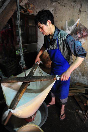 記者看到,主人開(kāi)始磨豆子了,將泡好的豆子倒入機(jī)器內(nèi),一勺一勺的盛。并一邊磨一邊和我們交談,現(xiàn)在省事多了,以前都是推磨子的,而且制作工藝也十分講究。