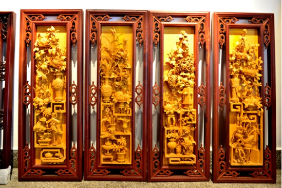 《四條屏掛件》脫胎于“格子門”的上裙板,是由實(shí)用到觀賞的一種很好的轉(zhuǎn)換,是目前最走俏的新產(chǎn)品,無(wú)論是賓館客廳或居家,古樸典雅的木雕“四條屏”會(huì)增添不少東方文化的雅趣,越來(lái)越受到人們的喜愛(ài),許多人都把它作為木雕藝術(shù)珍品收藏。為了給世人留下藝術(shù)精品,許多工藝師潛心研究設(shè)計(jì)、精心雕刻,用半年、甚至一年多的時(shí)間才完成一件“四條屏”。這些精心之作,疏密有致、變化統(tǒng)一,構(gòu)圖飽滿,穿插纏繞,重重疊疊的層層透雕,無(wú)不凝聚著制作者的智慧與心血?!端臈l屏》的圖案設(shè)計(jì),主要有三種內(nèi)容:(1)博古;(2)花卉;(3)花鳥(niǎo)。人物、山水類型的極少。圖案喻意與格子門相近。