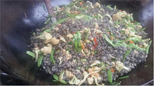 烹制蚵柳,先要挑選好個肥形大的鮮蚵,用心幾遍洗凈,再用篩細的地瓜粉薄薄拌勻,務求每只蚵仔獨立成團,再兜在漏勺里到滾開的水里焯一下即起來,再攤放有竹篩簸里晾干瀝水一個晚上。第二天中午烹制,先把油燒熱,倒入生姜末過油,再依次倒入花菜、荷蘭豆、紅蘿卜絲、芫荽等“菜腳”與鹽、雞粉、料酒、蠔油、胡椒粉、醋等佐料一并翻炒,菜蔬生汁,試嘗咸淡,再倒入已備好的蚵仔團翻炒,只需幾下,便已熟透,即可裝盤。