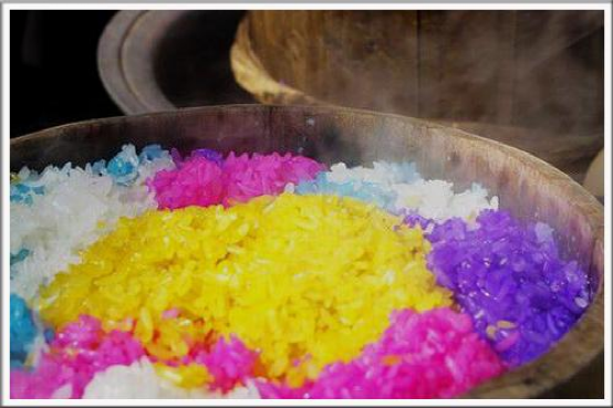 節(jié)日之前,苗族婦女就從山上采集楓葉和野榛葉,用鐵鍋煮開,倒進(jìn)盆子,冷卻后,將白花花的糯米放入盆子浸泡。節(jié)日當(dāng)天早上,苗族婦女們?cè)缭缙饋?,將裝有染色糯米的木箕放在三腳架的鐵鍋上,燒起火慢慢地蒸。約一個(gè)小時(shí)過后,木箕里的糯米蒸熟成糯米飯,散發(fā)滿屋的芳香。這時(shí),苗族婦女就將糯米飯倒進(jìn)飯盆,用手前后翻轉(zhuǎn),直到糯米飯里的水蒸氣全部散發(fā)。