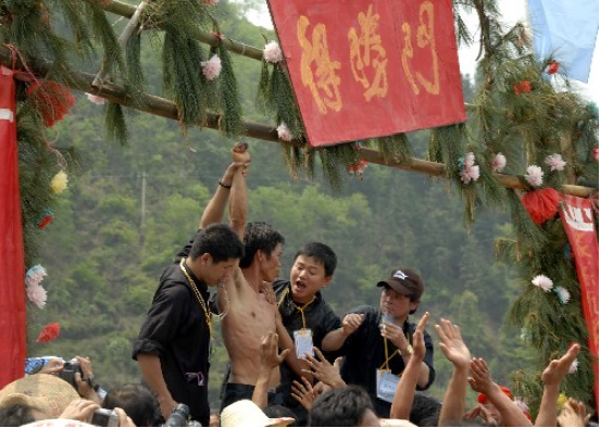 在三江縣富祿鄉(xiāng)第130屆花炮節(jié)上表演苗族大木拉山