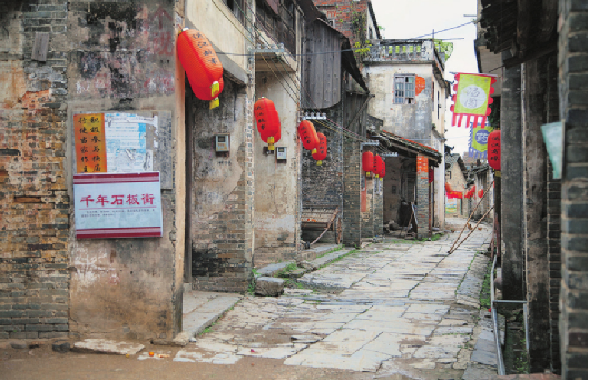 千年老街自北向南,寬約4米、長(zhǎng)約300米,青石板路面。沿街多為典型的嶺南風(fēng)格建筑,二層騎樓,房屋寬敞深長(zhǎng),一樓為鋪,二樓為居,前為店,后為廚。天井頂面多設(shè)明瓦數(shù)塊,以取日光照射,木梯扶手、門窗雕刻的粗細(xì)花紋無(wú)聲地證明它們?cè)?jīng)的風(fēng)采??吹贸霎?dāng)年舊街果然是繁華過(guò)的,有飯館,有劇院,有酒肆,有客棧,有百貨,街道排水、布局都很合理,有的街道至今在門前仍有留有水道。