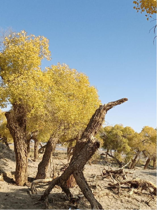 每當深秋季節(jié),胡楊樹葉變得一片金黃,形成胡楊秋色,樹影婆娑,奇妙絕倫,賞心悅目。漫步在濃郁的胡楊林中仿佛進入神話般的仙境。茂密的胡楊千奇百怪,神態(tài)萬般。粗壯的幾人難以合抱,挺拔的七、八丈之高,怪異的似蒼龍騰越,似虬蟠狂舞,令人驚奇不已,嘆為觀止。僅就密密匝匝的樹葉,也是風采獨有。幼小的胡楊,葉片狹長而細小,宛若少女嫵媚的柳眉,人們常常把它誤認為柳樹;壯齡的胡楊,葉片又變成卵形、闊卵形或三角形,猶如興安嶺的白樺;進入老年期的胡楊,葉片才定型為橢圓形。更令人稱奇者,在同一棵胡楊樹冠的上下層次,還長著不同形狀的葉片,因此,又稱“異葉楊”