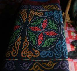 北方少數(shù)民族地區(qū)都沒(méi)有養(yǎng)蠶的條件,所以用于刺繡的絲線都需要與中原的物品交流當(dāng)中索取,這也是在蒙藏地區(qū)有用各色的布出現(xiàn)貼花的原因??茽柷哔N花就是把各式各樣布料剪成紋樣貼在布底上再經(jīng)過(guò)縫邊,鎖邊而成的一種刺繡種類。這種貼繡在科爾沁蒙古族中是很普及的一種形式。這種貼繡能較好地運(yùn)用大塊面的色彩,用料簡(jiǎn)單,是刺繡中常用的一種方法。科爾沁刺繡在面料上刺繡圖案時(shí)用三種方法,第一種是把刺繡的圖案畫在紙上在把紙樣按照輪廓剪下來(lái),然后放在要繡的底樣上,按照紙樣的輪廓進(jìn)行刺繡。第二種方法是把圖案如實(shí)地在錦緞上描下來(lái)進(jìn)行刺繡。第三種是直接在錦緞上自由發(fā)揮,繡出各種圖案。