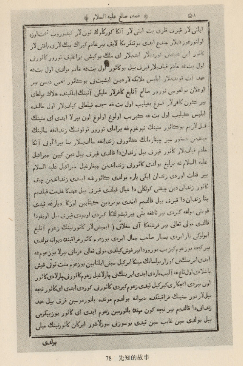 察合臺文著作。1899年喀山大學鉛印本。高25.5厘米,寬17.5厘米,共510頁。作者拉布古孜,寫于14世紀。圖為《先知薩立哈故事》中的一頁。寫的是異教徒們在魔鬼的支使下將要成為先知薩立哈的父親卡斯瓦爾關進地牢,天使奉真主之命使他逃出后與妻子見面的故事?,F(xiàn)藏新疆博物館。該書語言豐富生動,屬哈喀尼耶語(后期回鶻語)和察合臺語之間的過渡語言,一定程度上反映了當時的口語,是研究維吾爾語言史和文學史的重要資料。