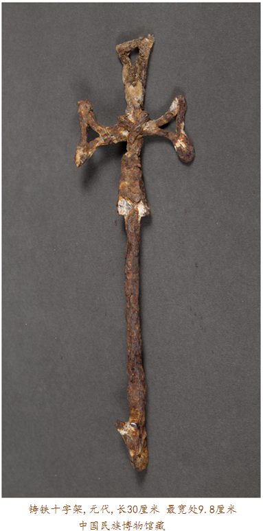 眼前此件在內(nèi)蒙古達茂旗出土的元代鎏金青銅十字架,四面排列有浮雕金剛杵紋,其正面每個金剛杵圖案上均有鎏金裝飾,十字架上部穿孔則可用于懸掛。金剛杵是藏傳佛教里的修行法器,象征力量與智慧;而十字架則是基督教文化的標志,如此混搭,歷史便要傳遞出種種:在信仰藏傳佛教的蒙古高原,金剛杵,象征無畏圓滿,十字架,則代表救贖重生,東西方文化的結(jié)合亦呈現(xiàn)某種文明可能達到的無可比擬之高度。