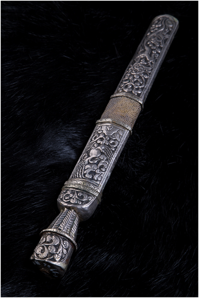 康區(qū)人性格粗獷豪放,刀對于他們來說,主要是戰(zhàn)斗的武器,他們愛刀勝過愛牛羊,一把好刀就是一筆財(cái)富,其形象也會因之而無形中高大起來。正因?yàn)槿绱耍麄儾粌H對刀本身有較高的要求,對其作為襯托武士氣概的刀的外在形制也有特殊的喜好。刀鞘材料一般使用黃、白銅或純銀,鑲珠嵌寶,正面雕龍畫鳳,背面線刻卷草,佩在身上,起到了美觀和威懾的雙重作用。