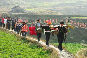 如有路人在途中遇見新娘一行,可將隨身的衣服鋪在路面,并將隨身帶的貴重物品放在衣服上,這樣就會得到娶親隊伍的“獎賞”。