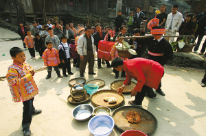我們尾隨著娶親隊伍進寨,發(fā)現(xiàn)寨子中間的路上也擺著很多簸箕、臉盆之類的容器,原來,村民們也要“討賞”呢!聽高邦寨的村支書說,遇到這種情況,路人放的東西越貴重,娶親隊伍留下的肉食就越豐盛,有時甚至會放下一整只雞或鴨呢!